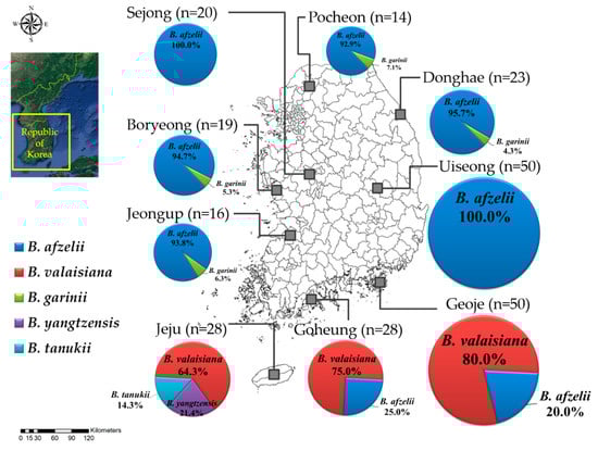 Borrelia burgdorferi sensu lato (s. l.) was first identified in the Republic of Korea (ROK) in Ixodes ticks and the wild rodent Apodemus agrarius in 1993, with the first human case of LD reported in the same year [,]. Lyme disease (LD) was designated as a national notifiable infectious disease in 2010, and two cases were identified in 2011. Since then, the number of cases has gradually increased; 23 cases have been reported in 2019, including 11 imported cases []. To date, various molecular and serological studies have identified the pathogenic cause of LD in ticks and animals including wild rodents, migratory birds, water deer, and dogs [,,,,,,,,]. Borrelia afzelii and B. garinii were first identified in I. persulcatus and wild rodents, respectively, from the Gangwon province. Moreover, other genospecies of B. burgdorferi s. l., including B. tanukii, B. turdi, B. yangtzensis, B. bavariensis, and B. valaisiana, have been identified in ticks and wild animals [,,,,,,]. Regional information regarding ticks, wild animals, and B. burgdorferi s. l. genospecies has been revealed sporadically in the ROK; however, the main B. burgdorferi s. l. genospecies and its prevalence within tick distributions remain unknown.