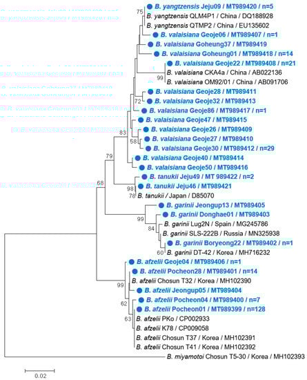 A total of five B. burgdorferi s. l. genospecies were identified, of which the most common genospecies were B. afzelii (62.5%), followed by B. valaisiana (31.9%), B. yangtzensis (2.4%), B. garinii (1.6%), and B. tanukii (1.6%; Table 1). In the regional distribution, B. afzelii was found in all the inland sampling regions except for Jeju Island, while Sejong and Uiseong located in the central inland regions only identified B. afzelii. Borrelia valaisiana was found in Geoje, Goheung, and Jeju Island, which are located in the southern sampling regions, and displayed a higher prevalence than other genospecies. Specifically, B. yangtzensis and B. tanukii were only found on Jeju Island (Figure 1).