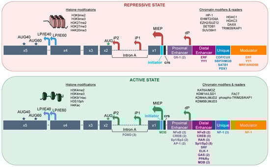 MIE locus architecture during repressive and active states. Histone modifications and chromatin modifiers and readers associate with the entirety of the MIE region. On the other hand, transcription factors are recruited to the enhancer, unique, and modulator regions. Together, these factors regulate the balance of this locus between repressive (top) and active (bottom) states. During latency and quiescence, the MIE locus is repressed, while reactivation triggers the switch to a more active state, which is maintained during lytic replication. When repressed, the locus is in a closed chromatin conformation (top), which is relaxed and opened once activated (bottom). Chromatin modifiers and readers are noted for each state at the top right of each box. Transcription factors are shown below the locus and are color-coded based on the region to which they bind. Numbers next to the transcription factors denote the number of sites within that specific region. Those without a number have a single site within the designated region. AUG40 and AUG60 (blue asterisks) denote the start sites for IE40 and IE60, respectively. Canonical AUG noted by green asterisk.