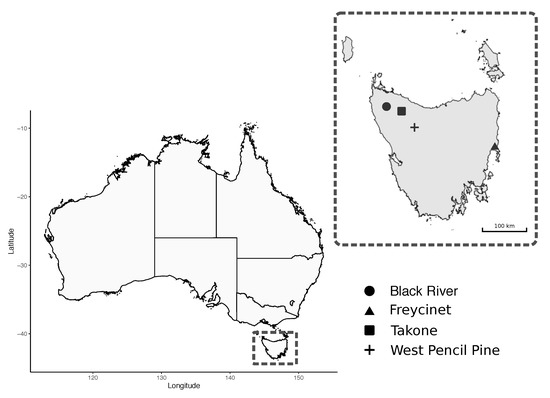 - Brüniche-Olsen, A.; Jones, M.E.; Burridge, C.P.; Murchison, E.P.; Holland, B.R.; Austin, J.J. Ancient DNA tracks the mainland extinction and island survival of the Tasmanian devil. J. Biogeogr. 2018, 45, 963–976. [Google Scholar] [CrossRef]