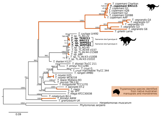 - Paparini, A.; Irwin, P.J.; Warren, K.; McInnes, L.M.; de Tores, P.; Ryan, U.M. Identification of novel trypanosome genotypes in bative Australian marsupials. Vet. Parasitol. 2011, 183, 21–30. [Google Scholar] [CrossRef]