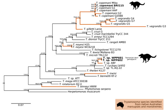 - Austen, J.M.; Reid, S.A.; Robinson, D.R.; Friend, J.A.; Ditcham, W.G.; Irwin, P.J.; Ryan, U. Investigation of the morphological diversity of the potentially zoonotic (Trypanosoma copemani) in quokkas and Gilbert’s potoroos. Parasitology 2015, 142, 1443–1452. [Google Scholar] [CrossRef] [PubMed]