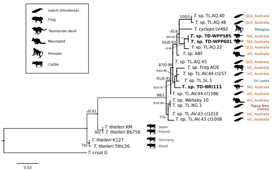 - Hamilton, P.; Stevens, J.; Gidley, J.; Holz, P.; Gibson, W. A New Lineage of trypanosomes from Australian vertebrates and terrestrial bloodsucking leeches (Haemadipsidae). Int. J. Parasitol. 2005, 35, 431–443. [Google Scholar] [CrossRef] [PubMed]