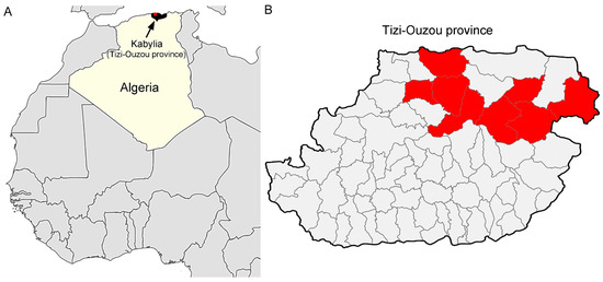 Map of Tizi-Ouzou city (Algeria); (A) geographical location of the sample collection; (B) elements colored in red correspond to the 8 municipalities selected.