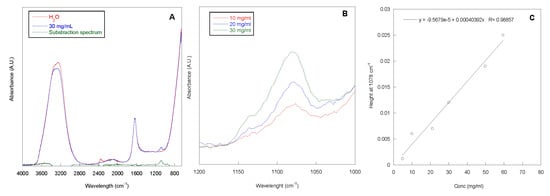 ATR-IR spectra. ATR-IR spectra of water, P388 water solution at 30 mg/mL and the relative subtraction spectrum (A). ATR-IR spectra of P388 water solution at different concentrations in the 1200–1000 cm−1 spectral range (B). Calibration curve peak height at 1078 cm−1 vs. P388 concentration (C).