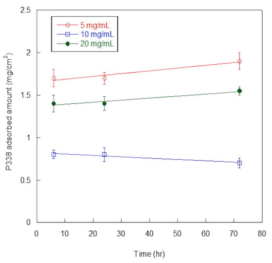 At all of the explored concentrations (5, 10, and 20 mg/mL), adsorbed P388 amount was similar at 6 h and 24 h, and increased only slightly at 72 h, except for 10 mg/mL concentration. Such finding suggested the adsorption was fast so that the maximum adsorption was already reached at 6 h. Additionally, at any time of adsorption (6, 24, or 72 h), the highest adsorption amounts were obtained at 5 mg/mL P388 concentration. Presumably, the desorption process competed with the adsorption one at higher P388 concentrations.