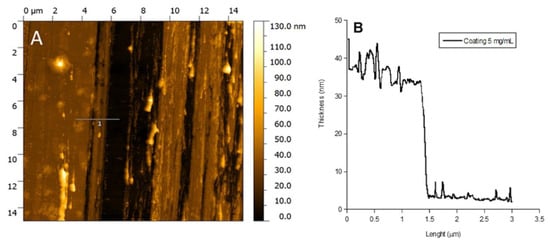 In Figure 4, the Atomic Force Microscopy (AFM) image and the thickness profile of the P388 catheter coating obtained at 5 mg/mL P388 concentration are reported. The black path present in the image is the one done by scratching the surface with a needle. As it can be observed, the coating is homogeneous and with a thickness of ca. 35 nm (Figure 4B).