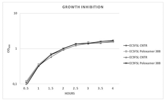 Overnight inocula of E. coli Ec5FSL and Ec9FSL strains in LB broth were adjusted to OD600 values of 0.02 in 4 mL of sterile LB broth, and 1 mL of P388 solution at 25 mg/mL concentration was added to each culture (5 mg/mL final concentration). The ODs cultures were measured at half-hourly intervals through a 5 h incubation period under shaking at 280 RPM. Growth medium without bacteria was used as negative control, while positive controls were E. coli isolates grown in LB and sterile water in order to obtain equal volumes for all samples. The periodic measures were plotted to obtain a growth curve, so to determine the growth rate and generation time of Ec5FSL and Ec9FSL in presence of P388.