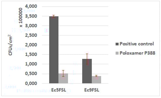 Antifouling activity of P388 in static conditions. CFU/cm2 results of Ec5FSL and Ec9FSL biofilms formed on P388-adsorbed segment of silicone urinary catheter (Poloxamer 388) and on unadsorbed catheter (positive control).