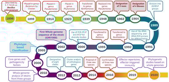 The taxonomy and nomenclature of the “bacterial wilt pathogen” changed frequently with the evolution of new technologies. First named Bacillus solanacearum [13], the pathogen was reclassified multiple times before it was transferred to the current genus, Ralstonia. A historical review will emphasize the advances in technology that enabled increasingly greater precision in bacterial classification. Phylogenetic and evolutionary studies have been widely applied to address the significant heterogeneity among strains. The discovery of new strains from different geographical habitats has prompted further reclassification based on genomic analyses. The major events in the taxonomic history of this organism over the past 124 years are shown in the timeline (Figure 1). Genome organization, pathogenicity-related effectors, virulence pathways, and genome-based phylogenetic relationships have increased our understanding of this heterogeneous pathogen.