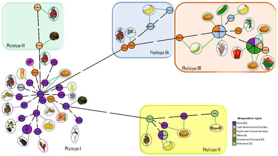 The high level of diversity in R. solanacearum was highlighted by the differences between the nucleotide composition, host range, and adaptability. Castillo and Greenberg provided two possible explanations for diversity within otherwise clonal populations: First, the populations may have evolved separately in geographical isolation, resulting in a distinct population structure for each phylotype [71,76]. The recombination analyses showed that the major and minor parents of a recombinant sequence in phylotypes III and IV were from their own respective subpopulations from the same geographical niche and not from phylotypes I (Asia) or II (America) [76]. A second explanation hinged upon the presence of rare genotypes that recombine at high rates and some emerge as clones through selective advantage and compete with the preexisting subpopulations to acquire a geographical niche [76,103]. Strains in phylotypes III and IV were the most diverse, suggesting that rare genotypes may exist, whereas the phylotypes I and II have clonal complexes that may have developed after acquiring genes that confer selective advantages over the original genotypes [76]. As might be expected, geographical isolation and spatial distance appeared to be the driving force in shaping the population structure of this species. The network representing the genealogy of RSSC strains is shown in Figure 4.
