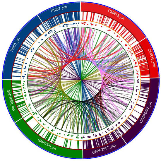 Circa plot showing the presence of predicted genomic islands in representative strains for each Phylotype of the RSSC. Track 1 (outer circle) shows the relative size of respective genomes: Phylotype I (GMI1000), Phylotype II (CFBP2957), Phylotype III (CMR15) and Phylotype IV (PSI07). The Ch tag stands for the chromosome and the mp tag stands for the megaplasmid. Approximate size of the replicons are: CMR15: ch—3.59 Mb, mp—2 Mb; CFBP2957: ch—3.42 Mb, mp—2.2 Mb; PSI07: ch—3.52 Mb, mp—2.09 Mb; GMI1000: ch—3.71 Mb, mp—2.1 Mb. Track 2 shows the relative positions of predicted genomic islands in their respective genomes. Track 3 is a scatter plot showing the GC content of the virulence gene coding sequences in the genome. Track 4 is a ribbon plot showing the links between the genomic islands in each genome. The image was generated using supplemental data of Remenant, et al. [86]; Island Viewer 4 software was used to predict genomic islands present in the GMI1000 genome retrieved from NCBI GenBank genome database. The Circa plot was created with Circa software (http://omgenomics.com/circa).
