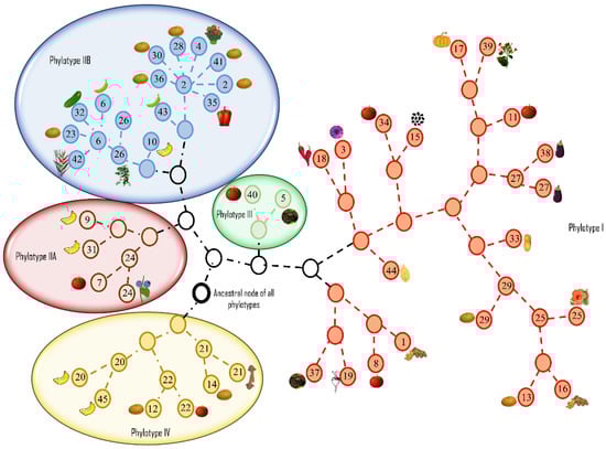 The introduction of phylotype and sequevar as new standards for classification led to further comparisons of phylogenetic relationships among the worldwide population of R. solanacearum strains [72,74]. Most strains had previously been characterized by race and biovar and now had to be re-evaluated before conclusions could be made regarding their phylogenetic relationships. The relationships between phylotypes and their hosts of origin are shown in Figure 2.