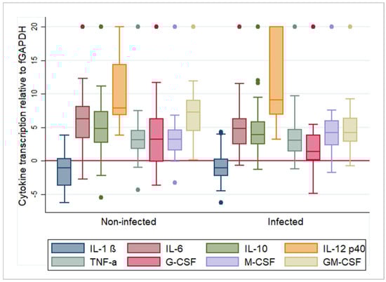 Box and whisker plots illustrating the variability and average relative transcription levels for all examined cytokines, post feline infectious peritonitis virus infection (“infected”) and mock infection (“non-infected”). For each cytokine, results from all animals and time points were pooled. The values are based on the difference in RT-qPCR threshold cycle (ΔCt) values for each cytokine in relation to the house-keeping gene feline (f)GAPDH. Negative values indicate that the cytokine is transcribed at a higher level than GAPDH. The boxes depict the median and interquartile (IQ) range with whiskers extending to the highest and lowest values which are within 1.5× the IQ range. Outliers beyond this are individually marked. Values at 20 ΔCt represent samples where cytokine transcription was not detected. IL-1β/6/10/12p40—interleukin 1 beta/6/10/12p40; TNF-α—tumor necrosis factor alpha; G/M/GM-CSF—granulocyte/monocyte/granulocyte monocyte colony stimulating factor.