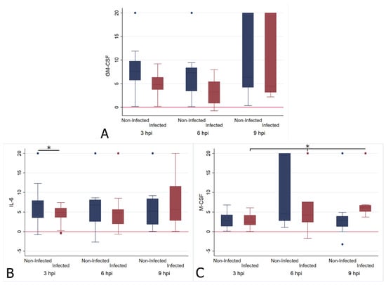 Box and whisker plots illustrating the changes in transcription levels for GM-CSF (A), IL-6 (B) and M-CSF (C) at 3 (n = 25), 6 (n = 19) and 9 (n = 18) hours post FIPV infection (“infected”) in comparison to mock infection (“non-infected”). The values are based on the ΔCt values for each cytokine in relation to the housekeeping gene fGAPDH. Negative values indicate that the cytokine was transcribed at a higher level than fGAPDH. The boxes depict the median and interquartile (IQ) range with whiskers extending to the highest and lowest values which are within 1.5× the IQ range. Outliers beyond this are individually marked. Values at 20 ΔCt represent samples where cytokine transcription was not detected. * indicates a p value of at least <0.05, with values for each cytokine given in the text.