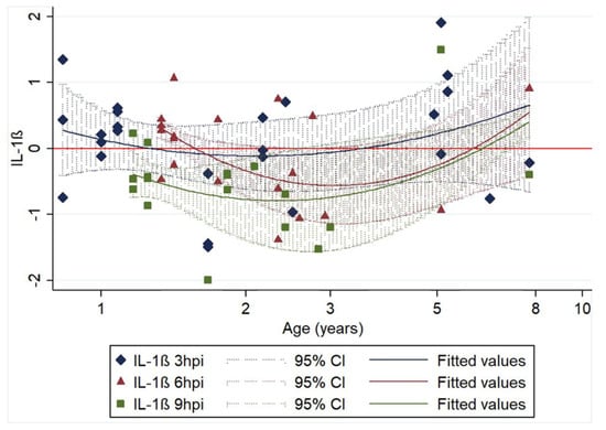 Association of relative IL-1β transcription levels (log10 of ΔΔCt) with age and time of harvesting (3 (25 samples), 6 (19 samples) and 9 (18 samples) hours post infection (hpi)). The 62 data points represent the difference in IL-1β transcription between infected and non-infected cell cultures of the same animal sample. Regression lines (including 95% CIs) are fitted for each time post infection. Regression equation: y = 0.255 − 2.565x + 3.405x2 − 0.011z − 0.509ω; n = 62; R2 = 0.2027; p < 0.05; age (x): p < 0.05; age2 (x2): p < 0.01; 6 hpi (z): p = 0.956, 9 hpi (ω): p < 0.05.