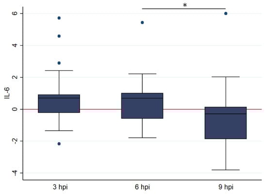A similar trend was seen for IL-6, with no significant association with age but with a significantly higher relative IL-6 transcription at 6 hpi (geometric mean: 6.159) compared to 9 hpi (geometric mean: 0.278, t = 2004, df = 41, p < 0.05) (Figure 4). No model could be fitted to represent the data.