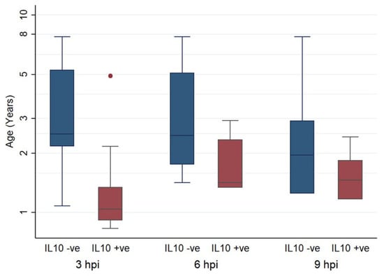 The age of animals whose monocytes had higher IL-10 transcription post infection than mock infection was significantly lower at 3 hpi and 6 hpi compared to 9 hpi, when examined by univariate analysis (3 hpi: t = 4.054, p < 0.001, 6 hpi: t = 4.054, p < 0.001, 9 hpi: t = 2.255, p = 0.185). This is illustrated in Figure 5. In total, 25 samples were examined at 3 hpi. In 13 (52%), IL-10 was lower in the FCoV-infected monocytes than the uninfected, 19 samples were examined at 6 hpi, from which 6 (31.58%) had lower IL-10 in the infected group, and 18 samples were examined at 9 hpi and in 12 (66.67%) the IL-10 was lower in the infected group.