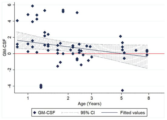 No significant association with age was identified for any of the other cytokines; however, GM-CSF relative transcription demonstrated a trend of declining with age, without any significant association with the time post infection (Figure 6).