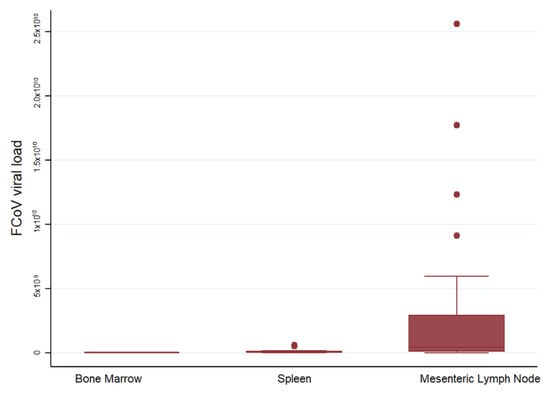 Mean viral loads were lowest in the BM, and increased in spleen and MLN in cats with FIP (Figure 7). A comparison of viral loads in the MLN of cats with and without FIP confirmed vastly (and significantly) higher loads in cats with FIP. The median 2ΔΔCt was 4.25 × 108 for 30 cats with FIP and 10584.78 for 10 FCoV-positive cats without FIP (p < 0.0001).