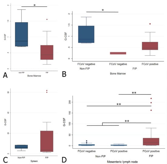 Relative levels of G-CSF transcription across different groups within all organs ((A,B) bone marrow; (C) spleen; (D) mesenteric lymph nodes). The amount of target was calculated by 2−ΔΔCT, using fGAPDH as the internal reference gene for normalization and expressed as an n-fold difference relative to the non-FIP group mean of the BM samples as a calibrator. The boxes depict the median and interquartile (IQ) range with whiskers extending to the highest and lowest values which are within 1.5× the IQ range. Outliers beyond this are individually marked. */** mark significant differences between groups (p < 0.05/p < 0.01). FCoV negative: negative qRT-PCR for FCoV; FCoV positive: qRT-PCR for FCoV-positive. FIP: feline infectious peritonitis.
