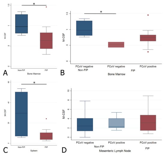 Relative levels of M-CSF transcription across different groups within all organs ((A,B) bone marrow; (C) spleen; (D) mesenteric lymph nodes). The amount of target was calculated by 2−ΔΔCT, using fGAPDH as the internal reference gene for normalization and expressed as an n-fold difference relative to the non-FIP group mean of the BM samples as a calibrator. The boxes depict the median and interquartile (IQ) range with whiskers extending to the highest and lowest values which are within 1.5× the IQ range. Outliers beyond this are individually marked. */** mark significant differences between groups (p < 0.05/p < 0.01). FCoV negative: negative qRT-PCR for FCoV; FCoV positive: qRT-PCR for FCoV-positive.