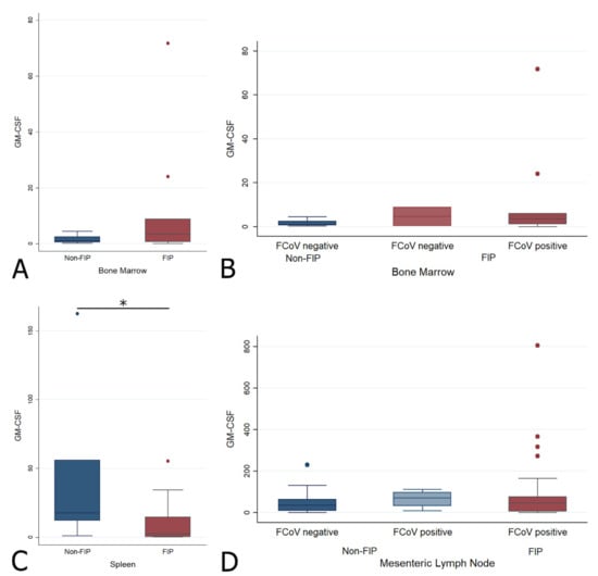 Relative levels of GM-CSF transcription across different groups within all organs ((A,B) bone marrow; (C) spleen; (D) mesenteric lymph nodes). The amount of target was calculated by 2−ΔΔCT, using fGAPDH as the internal reference gene for normalization and expressed as an n-fold difference relative to the non-FIP group mean of the BM samples as a calibrator. The boxes depict the median and interquartile (IQ) range with whiskers extending to the highest and lowest values which are within 1.5× the IQ range. Outliers beyond this are individually marked. */** mark significant differences between groups (p < 0.05/p < 0.01). FCoV negative: negative qRT-PCR for FCoV; FCoV positive: qRT-PCR for FCoV-positive.