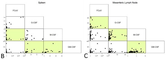 Correlations between FCoV (viral loads) and CSFs (relative mRNA transcription levels) across all cats for each organ ((A) bone marrow; (B) spleen; (C) mesenteric lymph nodes). Highlighted boxes indicate significant correlations.