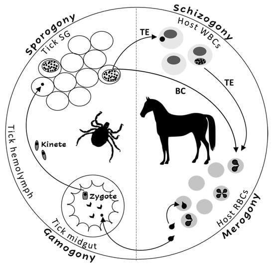 The life cycle of Theileria equi (TE) and Babesia caballi (BC) in the tick vector and in the equine host. RBC—equine red blood cells, WBC—equine while blood cells, SG—tick salivary glands.