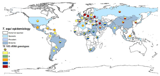 Global prevalence of T. equi, and the distribution of T. equi 18S rRNA genotypes. The map was constructed based on epidemiological data published in the last 20 years (2000–2019). Endemic: over 30%, prevalent: 10–29%, sporadic: under 10% or singular outbreaks. Genotyping was performed on all sequences submitted to GenBank and classification was based on previously reported clades.