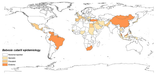Global prevalence of B. caballi. The map was constructed based on epidemiological data published in the last 20 years (2000–2019). Endemic: over 30%, prevalent: 10–29%, sporadic: under 10% or singular outbreaks.
