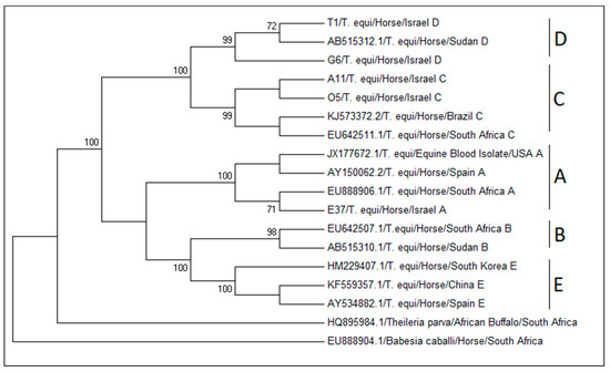 Since some inconsistencies exist between reports, we chose to re-classify all sequences submitted to GenBank rather than rely on previous reports. In addition, since some of the sequences were only used for species identification, our analysis included many sequences that have not been previously classified, thus expending the database of genotypes isolated in different locations. We chose to use a five-genotype classification system, although several studies have suggested that T. equi 18S rRNA should be categorized into three genotypes, such that genotypes B and E, and genotypes C and D may represent variants within one phylogenetic clade [136,248,249]. The distance matrix does show similarity between each pair; however, in our opinion, the phylogenetic distance was sufficient to regard them as different groups.