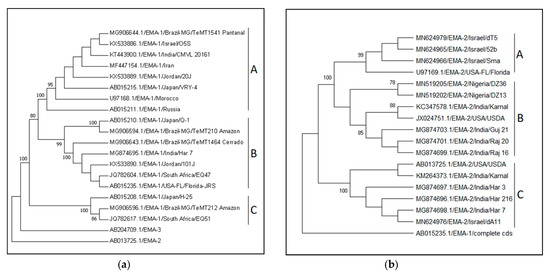 Only 29 T. equi ema-2 sequences have been submitted to GenBank, of which, 11 were classified as genotype A, 12 as genotype B and six as genotype C (Table S5). Genotype A sequences originated in Israel and the US; genotype B in India, Nigeria, and the US; and genotype C in India, Israel, and the US. The evolutionary divergence within each genotype was lower than 0.004 base substitutions per site, and between genotypes it ranged between 0.011 and 0.059 base substitutions per site [209] (Table 5b).