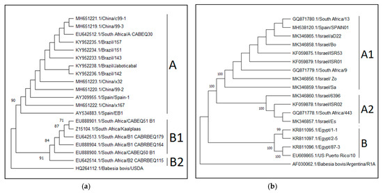 A total of 112 B. caballi rap-1 sequences were included in the analysis, of which 15 were classified as genotype A1, four as genotype A2, and 93 as genotype B [84] (Table S6). Genotype A1 sequences originated from Israel, South Africa, and Spain, A2 sequences were from Israel and South Africa, and genotype B sequences were from Brazil, China, Cuba, Egypt, Indonesia, Mongolia, Thailand, and the USA (Puerto Rico). Analysis of the evolutionary divergence between the 112 sequences revealed less than 0.021 base substitutions per site within each genotype, and between 0.121 and 0.320 base substitutions per site between genotypes (Table 6b). When the longer sequences were evaluated, genotype B was divided into two sub-genotypes (Figure 6); however, when the shorter sequences were compared, the divergence between these two sub-genotype was low (0.008 base substitutions per site) and more data (a longer sequence) are required to correctly classify many of the sequences in this group.