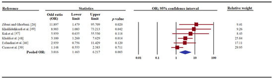 | Khalili et al. [48] | Iran | 41.2 ± 9.5 | 38.8 ± 7.6 | 70 | 20 (28.5) | 70 | 8 (11.4) | 0.02 |