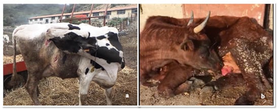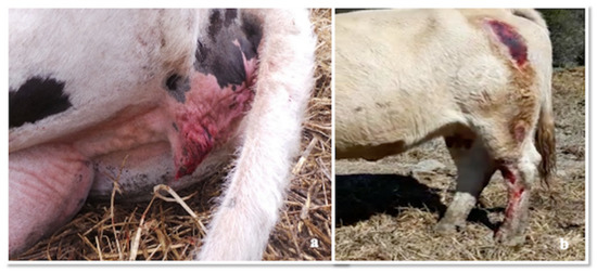 At general clinical examination, cattle showed aspecific symptoms such as anorexia, depression, restlessness, dehydration (15%), hyperthermia (39–40 °C), increased heart and respiratory rate with opaque and hyperaemic ocular, buccal and vaginal mucosa. Moreover, severe itching was the most characteristic and constant symptom with hyperexcitability and continuous licking/scratching of the distal parts of the hind limbs, flank and udder (Figure 2, Panels a,b; Video S1). At this level, severe lesions with haemorrhages, haemorrhagic suffusions and crusts were found, being worse in the nipples. Open wounds, cutaneous excoriations and oedema due to self-trauma, were also evident in perineal area and vulva (Figure 3, Panel a,b). Between an itch attack and the other, the animals were exhausted, with the head bent sideways in the position of self-heard. Unspecific neurological symptoms were also present, such as stiff gait, hind limb hypometria and proprioceptive deficit. Progressively the animals showed dyspnoea, hypersalivation, spasms of abdominal muscles, foaming and tympanicity; subsequently, these symptoms worsened, with teeth grinding and kyphotic posture as a result of evident abdominal pain due to colic-like syndrome with flatulence and complete impairment of digestive functions. In the final stages, the presence of an abundant salivary drain (no sialorrhea) was probably associated with the decrease of the swallowing reflex. Finally, the animals persist in recumbency and died within 2 or 3 days from the onset of severe symptoms. Besides, other potential causative agents of itching (mange and pediculosis) were excluded through the inspection of skin/skin lesions and by performing a skin scraping.