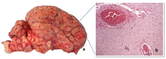 Telencephalon: (a) Gross macroscopic evidence of hyperaemia of leptomeninges; (b) Telencephalon, HE 100×, serious scattered haemorrhages in the grey and white substance, minimal multifocal gliosis, minimal non-purulent perivascular sleeves.
