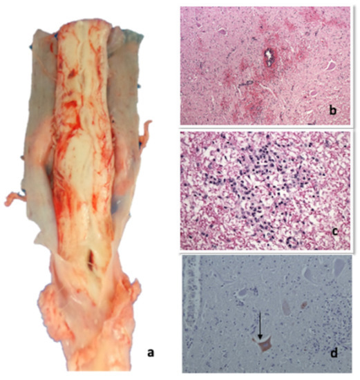 Cord: (a) gross macroscopic evidence of hyperaemia of the spinal cord; (b) spinal cord HE 100×, serious scattered haemorrhages in the grey and white substance, minimal multifocal gliosis, minimal non-purulent perivascular sleeves; (c) spinal cord, HE 400×, gliosis in the white matter; (d) spinal cord, HE 200×, Immunohistochemistry with pool of three MAbs (clone 1F2, 2E12 and 3D5) multifocal granular SuHv-1 positivity in the cytoplasm of the neurons (arrow).