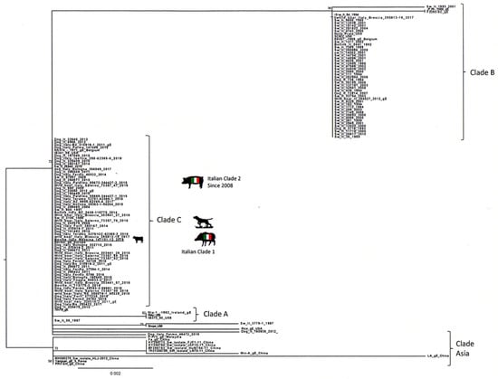 Phylogenetic analysis of the US8 gene (Figure 8) revealed the presence of 4 clades, named A, B, C and Asia, as reported in the study of Fonseca et al. [31]. Our bovine sequence was placed in the clade C together with all the Italian sequences that in the UL44 phylogenetic tree formed the Italian clades 1 and 2. Interestingly, this clade was reported by Fonseca et al. [32] as a new clade that included only one strain isolated in Brazil in 1986.