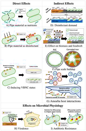 Overview of exemplar mechanisms by which pipe materials can affect OPs in premise plumbing. Depending on the circumstances, the pipe material itself can have direct effects on OPs growth by: (A) providing organic or inorganic nutrients that enhance growth, (B) acting as a growth-inhibiting antimicrobial, or (C) inducing viable-but-non-culturable (VBNC) status, from which microbes might recover in terms of infectivity and growth rates subsequent to exposure. Pipes can also indirectly affect OPs by: (D) consuming secondary disinfectants, allowing for microbial growth downstream, (E) evolving hydrogen gas or enhance nitrification, fueling autotrophic growth, or (F) developing thick pipe scales, which provide additional surface area for microbial growth, or (G) selecting for certain types of amoebae that are preferred hosts for bacterial OPs and protect them from negative effects of copper and disinfectants. Finally, pipes may unfavorably alter the physiology of microbes by increasing (H) OP virulence by selecting for resistance to phago-somal copper overload, or (I) resistance to antibiotics.