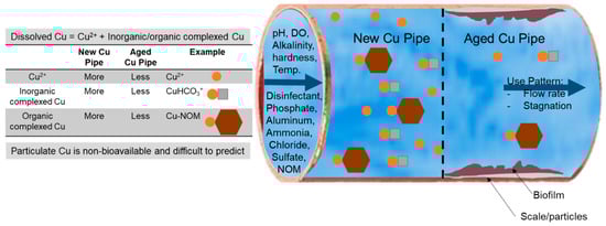Copper pipe corrosion and speciation is controlled by influent water chemistry and pipe age. Water chemistry parameters, such as pH, dissolved oxygen (DO), disinfectants, inorganic complexing agents (e.g., alkalinity, phosphate, and ammonia), organic complexing agents (e.g., natural organic matter (NOM)), hardness, trivalent metal ions (e.g., aluminum, iron), sulfate, and chloride can influence copper pipe dissolution, speciation, and the precipitation process. Copper is categorized as either free copper ions and inorganic complexed copper (considered relatively bioavailable), or organically complexed or particulate copper (considered relatively non-bioavailable). The level of copper species in the premise plumbing systems are also affected by the pipe aging (new vs. old pipes) and the water use pattern, including flow rate, stagnation and temperature.