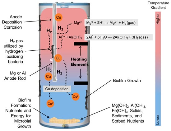 Water heater material interactions create multiple niches suitable for bacterial and opportunistic pathogen (OP) growth. Deposition of copper onto less noble metals (e.g., a water heater anode) can result in dramatically accelerated corrosion and release dissolved H2 gas, which is an electron donor for autotrophs. If the anode rod consists of magnesium, then the pH will become elevated as well. Figure adapted from Brazeau et al. [].