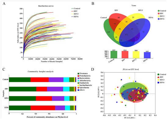 A total of 3,440,992 high-quality sequences was generated after quality checks. From healthy controls and HIV infections (before and over the course of ART), 919,503 and 2,521,489 sequences were obtained, respectively. Rarefaction curves showed a great sequencing depth of the saliva samples in our study that was suitable for the downstream phylogenetic analysis (Figure 1A). Taxonomic analysis illuminated 31 phyla, 56 classes, 113 orders, 189 families, 451 genera, and 797 species, and a total of 1177 OTUs were identified from the filtered sequences, specifically 835 OTUs in healthy controls, 824 OTUs in HIV infections at baseline, and 800 and 695 OTUs in the ART-treated group following three and six months of ART, respectively. Additionally, 471 OTUs were shared by the four groups. The shared OTUs among the groups are displayed in a Venn diagram (Figure 1B).