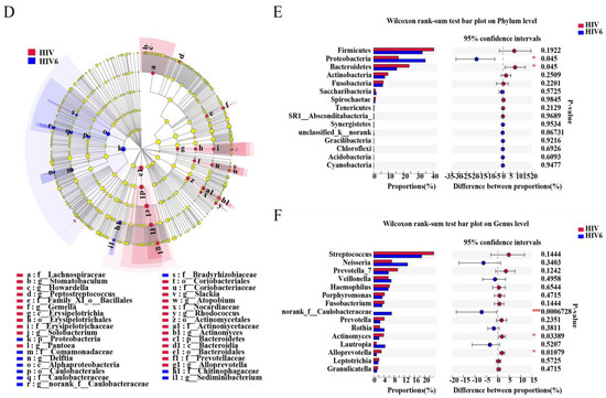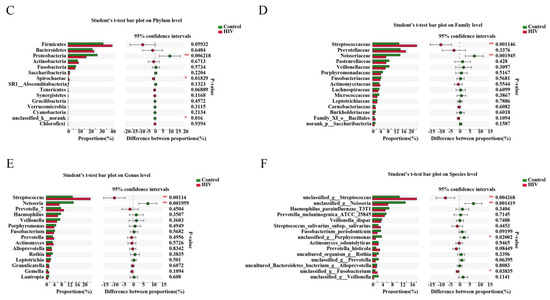 Different salivary microbiomes between HIV infections before ART and healthy controls. LEfSe identified the taxa with the greatest differences in abundance between healthy controls and HIV infections, healthy control-enriched taxa (green) and HIV-infected-enriched taxa (Red). Only the taxa meeting a significant LDA threshold value of >3 were shown (A,B). Comparisons of the relative abundance at the levels of bacterial phylum (C), family (D), genus (E) and species (F) between healthy controls and HIV infections. * 0.01 < p ≤ 0.05, ** 0.001 < p ≤ 0.01.
