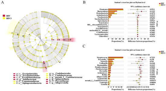 Although the differences in bacterial diversity were not obvious, the specific enriched bacterial taxa in the HIV-infected group before ART and the HIV-uninfected group were identified by linear discriminant analysis effect size (LEfSe). A cladogram was constructed to describe the structure of the salivary microbiota and the different predominant bacterial taxa between the two microbial communities. In addition, alterations in the composition of the salivary microbiota between the healthy controls and HIV-infected group before ART were also explored, utilizing the Student’s t-test at multiple taxonomic levels. LEfSe demonstrated that Neisseria was enriched in the healthy controls, whereas Streptococcus, Prevotella_1, nornank_f_Leptotrichiaceae and Filifactor were enriched in HIV-infected patients before ART (Figure 3A,B), which might be referred to as salivary biomarkers to distinguish the individuals with HIV infections. Furthermore, at the phylum level, there was a significantly increased abundance of Spirochaetae and a decreased abundance of Proteobacteria in the salivary microbiome of the ART-naïve, HIV-infected group, compared with the HIV-uninfected group (Figure 3C). At the family level, we found that Neisseriaceae was more prevalent in the HIV-uninfected group, whereas the relative abundance of Streptococcaceae in HIV infections of the ART-naive group was significantly higher (Figure 3D). At the genus level, two predominant genera of the HIV-uninfected group and of the ART-naïve, HIV-infected patients were different. Streptococcus was present at a higher relative abundance in the HIV-infected group, while Neisseria was found in the healthy controls (Figure 3E). All of these alterations indicated dysbiosis of the salivary microbiome after infection with HIV.
