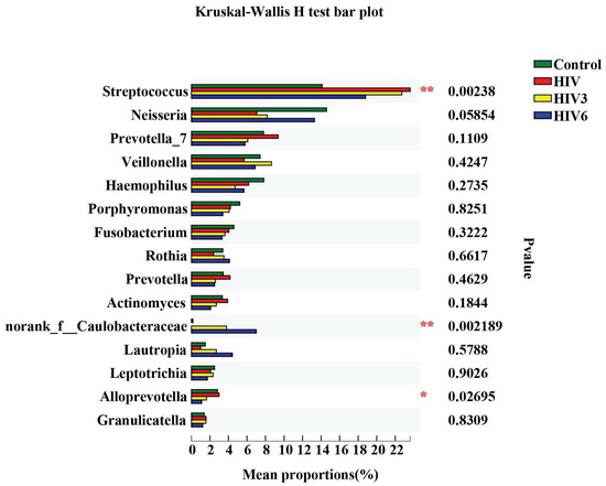 Comparative analysis of the four groups at the genus level. The tope 15 genera were picked out and analyzed by Kruskal–Wallis H test. * 0.01 < p ≤ 0.05, ** 0.001 < p ≤ 0.01.