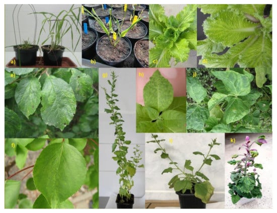 Virus-positive sampled plants: (a) barley cv. Doreen—plant with strong dwarfism (WDV) and a control, (b) wheat (WDV) cv. Fielder (c) Chinese cabbage (CaMV) (d) Chinese cabbage (TVCV) (e) plum (PPV) (f) apricot (PPV) (g) tobacco (PPV) (h) tobacco (TMV) (i) tobacco (TuMV) (j) common bean (BCMV) (k) goosefoot (BBWV-2).