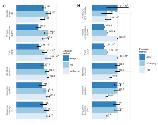 (a) Sample weights, the protein concentration of undiluted samples after the Removing solids step, protein yield per original leaf tissue weight used, identified peptides and proteins, and sample coverage for frozen winter wheat leaf tissue disrupted with a pestle in a mortar with liquid nitrogen (+m&p), or with a roller-ball crusher in urea solution (+rc), or by both (+m&p +rc). (b) MaxQuant LFQ normalized intensities for RuBisCO small chain, the protein concentration of undiluted samples after the Optional RuBisCO depletion step, protein yield per original leaf tissue weight used, identified peptides and proteins, and sample coverage for extraction protocol applied to frozen winter barley leaf tissue without RuBisCO depletion step (none), with a depletion step using phytate and Ca2+ ions (+Ca +phy), or with a depletion step using protamine sulfate (+ps). Error bars represent one standard error of the mean. All the groups contain exactly six samples (n = 6). For Identifed proteins, the total counts of MaxQuant proteinGroups, without contaminants, without proteins from reverse database, and without proteins only identified by site (by their peptide mass only, without supporting MS/MS spectrum) are listed.