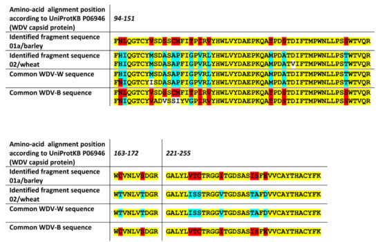 Alignment of detected discriminating peptide fragments of WDV capsid protein and strain-specific sequences for a given region in WDV-W and WDV-B strains. The positions with the same amino acid (yellow), with the detected amino acid in fragments similar to WDV-B (red), and with the detected amino acid in fragments similar to WDV-W (blue) are highlighted in different colors.