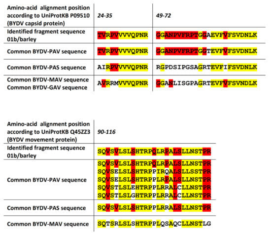 Even though only two fragments of the capsid protein of BYDV were detected, these peptides are part of the region where the BYDV disease species occurring in the Czech Republic (see []) differ in their amino acid sequence. Both detected capsid-protein peptide fragments for BYDV confirmed the virus sample to be BYDV-PAV (see Figure 6), which is in agreement with the virus used for inoculation. Only one of the two detected movement-protein peptide fragments also allowed discrimination of the BYDV disease species for the detected virus. Even though the fragment is from a region where several species-specific sequences exist, this fragment also confirmed the virus sample to be BYDV-PAV.